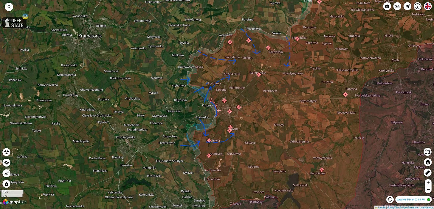 At the very least, as I figured they would, Kyiv’s forces have gone on the attack near Bakhmut to help keep the last citadel free. So far all that has been confirmed are two successful pushes aiming at the Wagner pincers that have been struggling in vain to cut off the roads to Chasiv Yar through Khromove and Ivanske for weeks now. What is apparent is that a whole lot of orcs turned tail and ran in short order, allowing Ukraine to make progress with surprising speed, given the standard pace of movement in this area over the past six months.